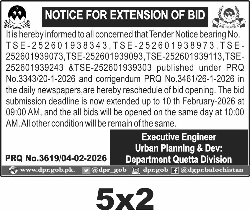 The new submission deadline is set for 10th February 2026 at 09:00 AM, with bid opening scheduled for the same day at 10:00 AM. Bids should be submitted physically at the office of the Executive Engineer, Urban Planning and Development Department, Quetta Division. Late submissions will not be entertained.