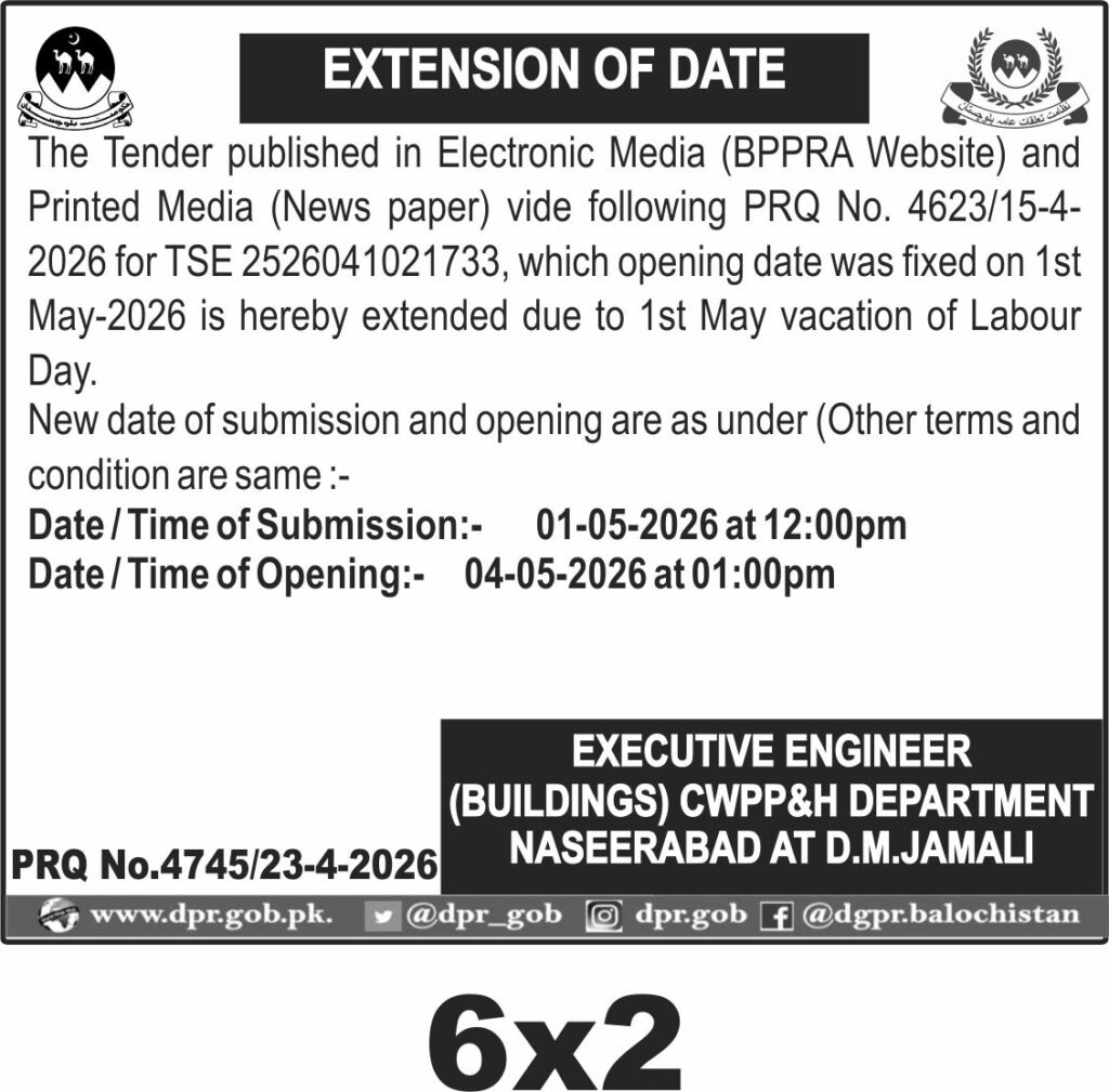 The Civil Works, Public Health and Buildings Department in Naseerabad, Balochistan, has announced an extension of the submission and opening dates for tender number TSE 2526041021733. This tender was originally scheduled for opening on 1st May 2026 but has been postponed due to the Labour Day holiday. The new submission deadline is now 1st May 2026 at 12:00 pm, with the opening of bids set for 4th May 2026 at 1:00 pm.
