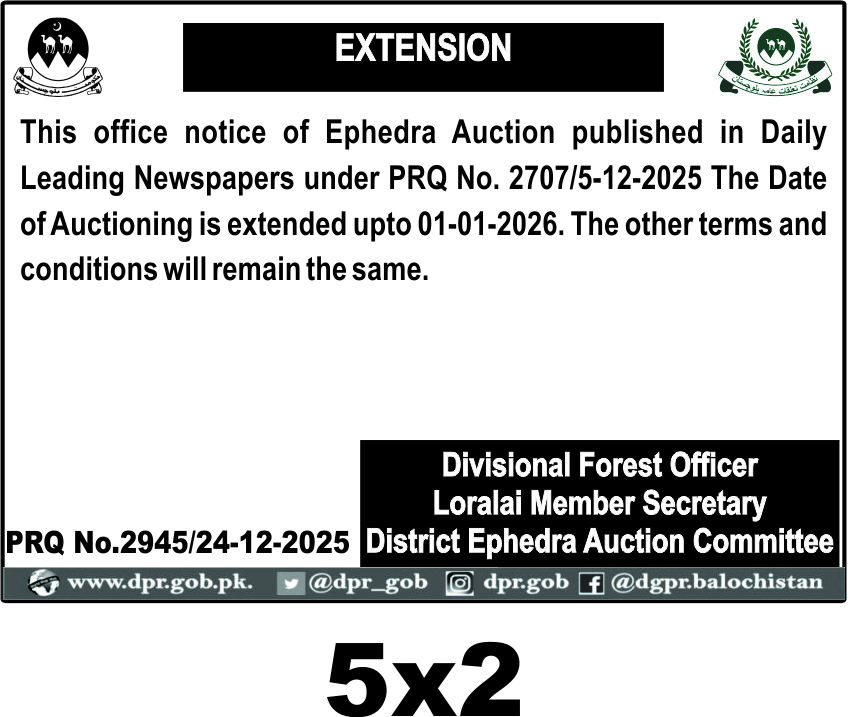 The announcement is issued by the Divisional Forest Officer and the Loralai Member Secretary of the District Ephedra Auction Committee. Interested parties should note the new closing date and adhere to existing auction terms. No changes to conditions or procedures accompany this extension.