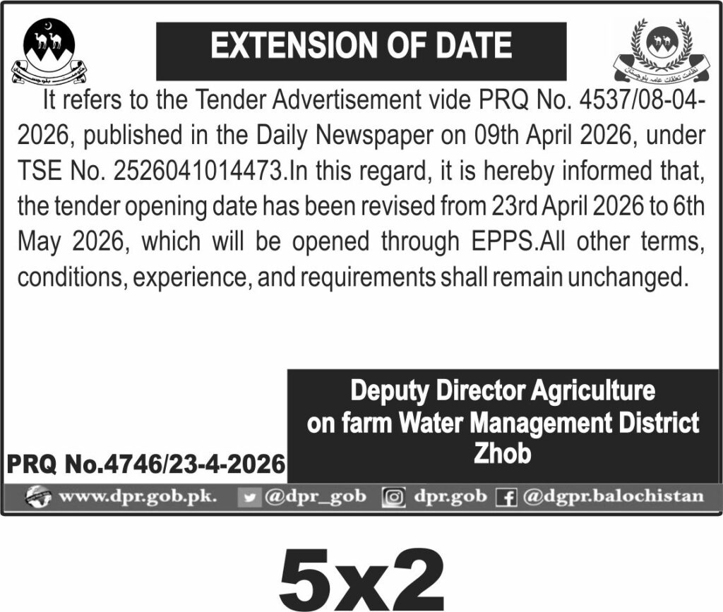The Deputy Director Agriculture on Farm Water Management District Zhob has announced an extension for the tender originally published on 9th April 2026 under PRQ No. 4746/23-4-2026. This procurement relates to works in the agricultural sector specifically focused on farm water management in Zhob, Balochistan. The tender involves activities essential for improving water management infrastructure to support agricultural productivity in the district.