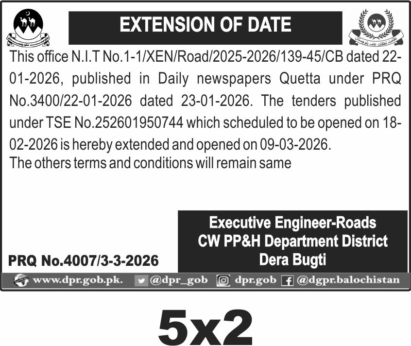 The submission deadline is now extended to March 9, 2026, with the tender opening scheduled on the same day. Interested parties should submit their sealed bids to the office of the Executive Engineer-Roads, CW PP&H Department, District Dera Bugti before the deadline.