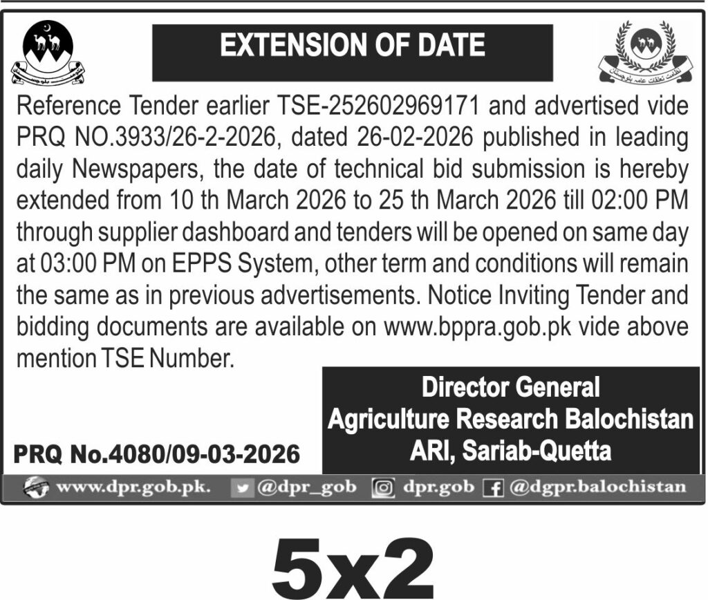 Extension of Technical Bid Submission for Agriculture Research Balochistan Tender