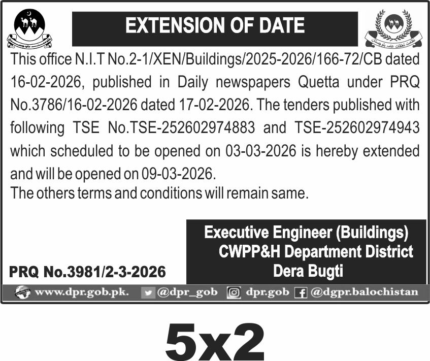 The submission deadline is now extended to 9-March-2026, with the tender opening scheduled on the same day. Interested parties should deliver their bids to the office of the Executive Engineer (Buildings), CWPP&H Department District Dera Bugti, before the closing time. Late submissions will not be entertained.