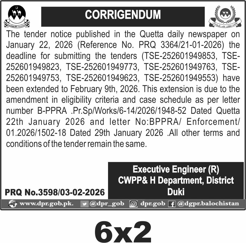 This notice announces an extension for the submission deadline of tenders related to the CWPP&H Department in District Duki, Balochistan. The original deadline published on January 22, 2026, has been extended to February 9, 2026, allowing bidders additional time to prepare and submit their proposals.
