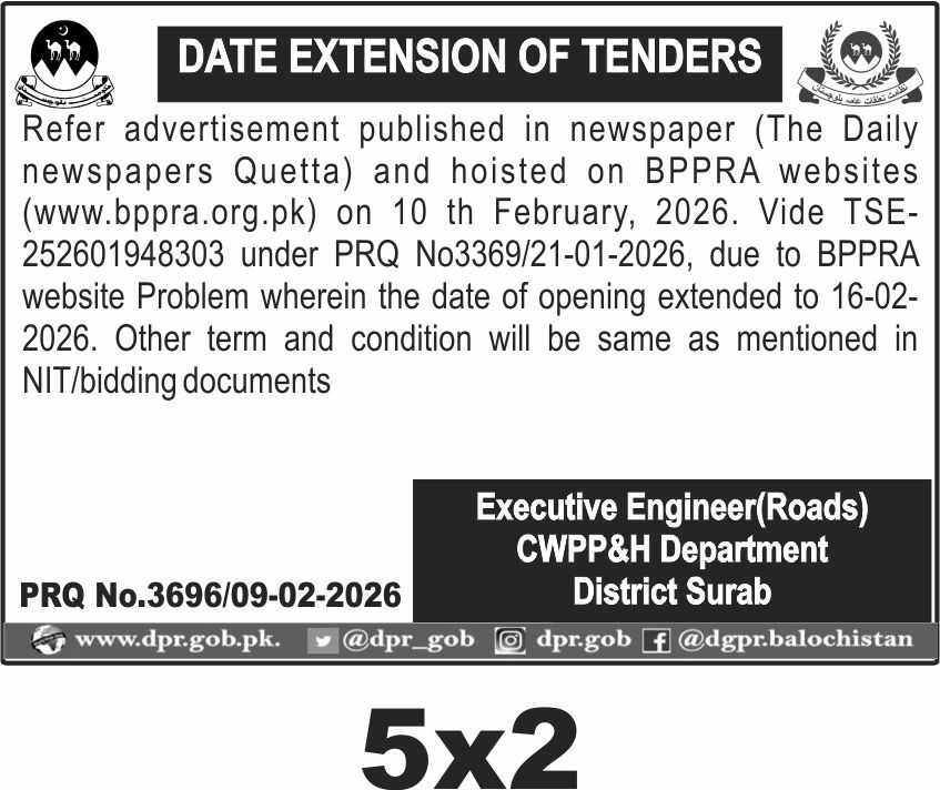 This notice announces an extension for the submission and opening of tenders related to road works in District Surab, Balochistan, issued by the CWP P&H Department. The extension is due to technical issues on the BPPRA website, pushing the deadline to 16th February 2026.
