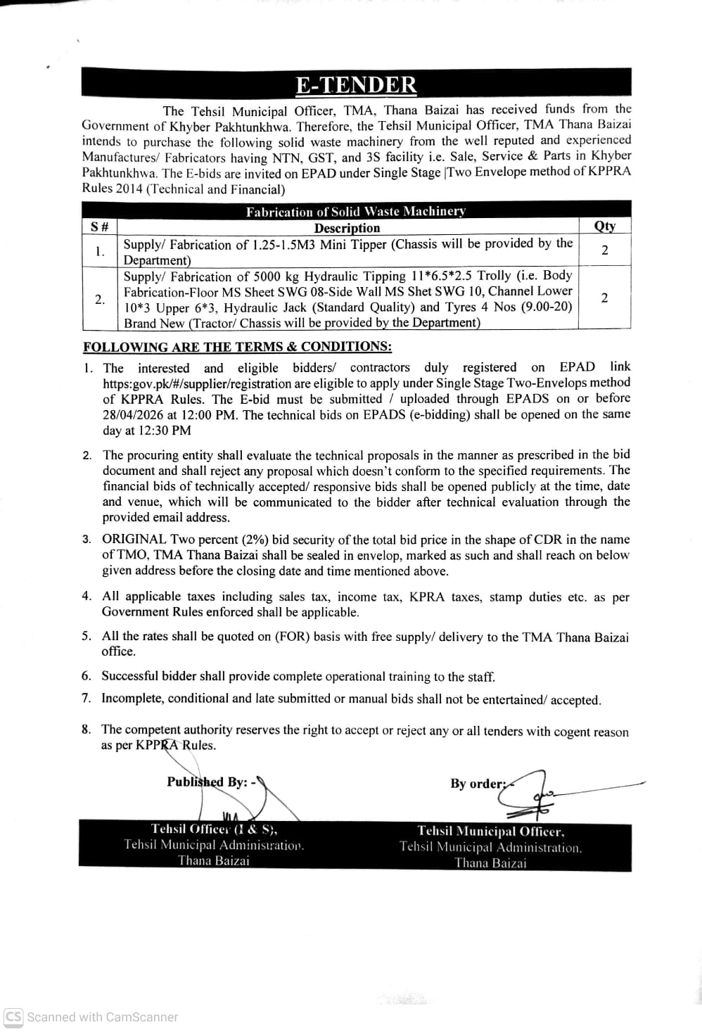 Eligible bidders must be well-established manufacturers or fabricators with NTN, GST, and 3S facilities including Sale, Service, and Spare parts in Khyber Pakhtunkhwa. Registration on the EPAD portal is mandatory, and the procurement will follow the Single Stage Two Envelope method under KPPRA Rules 2014. Bidders should submit their technical and financial bids electronically through EPADS by the deadline. A 2% bid security in the form of a CDR in favor of TMO, TMA Thana Baizai is required and must be submitted in a sealed envelope before the closing date.