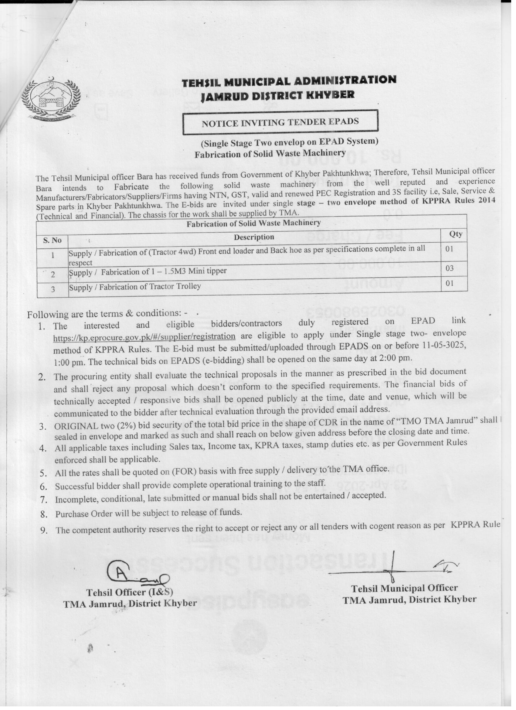 The Tehsil Municipal Administration (TMA) Jamrud in District Khyber is procuring fabrication services for solid waste machinery. This procurement includes the supply and fabrication of a Tractor 4wd Front End Loader and Backhoe, 1 to 1.5M3 Mini Tippers, and a Tractor Trolley. The chassis for these machines will be supplied by the TMA. This tender is specifically for experienced manufacturers, fabricators, suppliers, or firms with valid NTN, GST, and renewed PEC registration along with 3S facility for sale, service, and spare parts in Khyber Pakhtunkhwa.