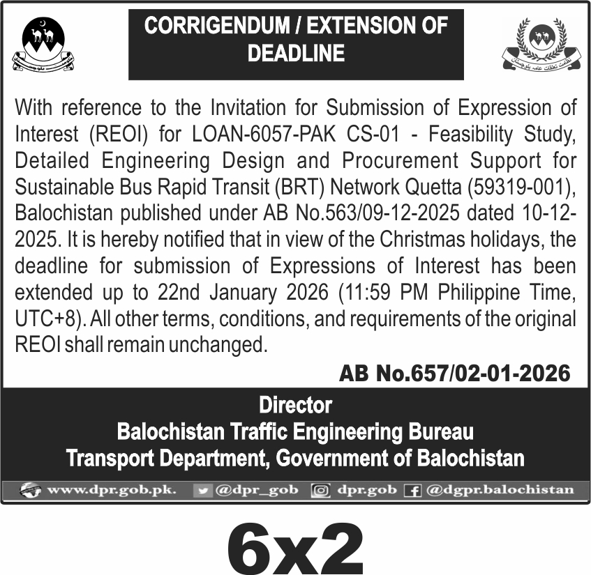 This tender invites Expressions of Interest for a detailed feasibility study, engineering design, and procurement support for a Sustainable Bus Rapid Transit (BRT) Network in Quetta, issued by the Balochistan Traffic Engineering Bureau under the Transport Department. The project focuses on developing a modern, efficient public transport system to improve urban mobility in Quetta, Balochistan's capital city.
