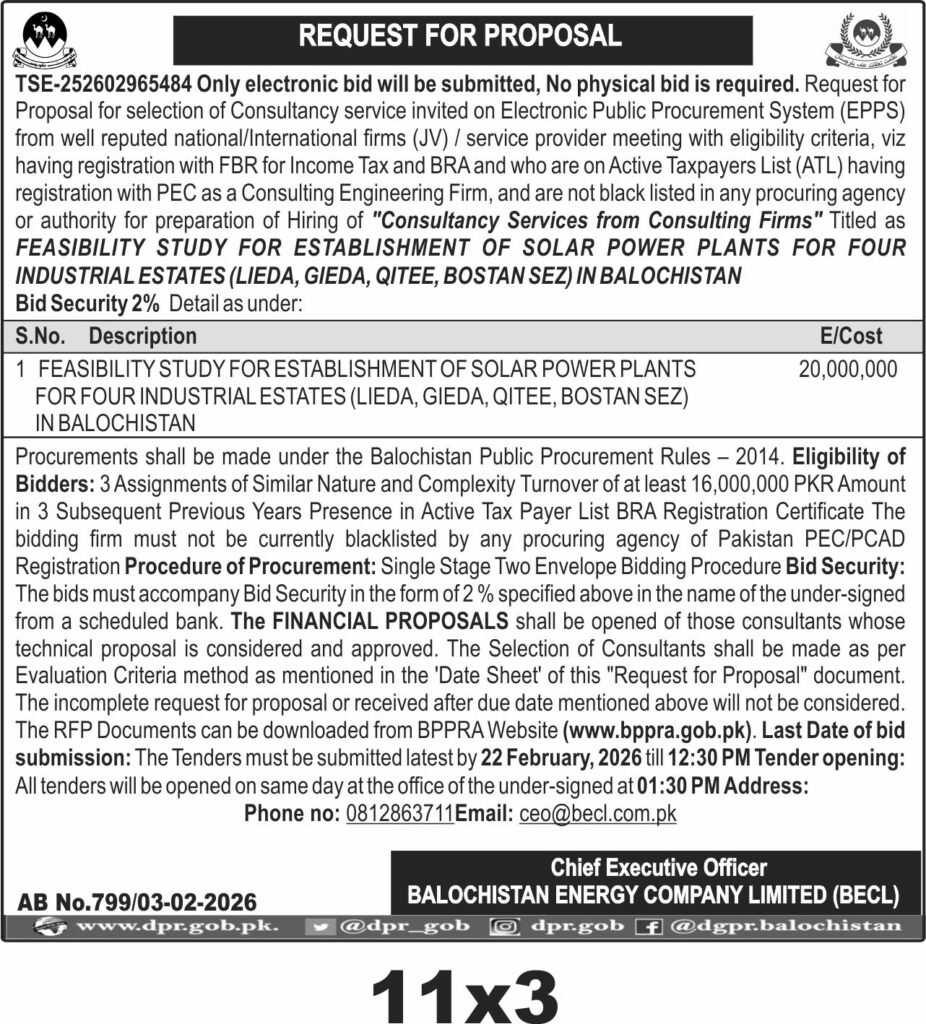 This tender invites consultancy firms to conduct a feasibility study for establishing solar power plants across four industrial estates in Balochistan, including LIEDA, GIEDA, QITEE, and BOSTAN SEZ. Issued by Balochistan Energy Company Limited (BECL), this opportunity focuses on renewable energy development within the province, emphasizing sustainable industrial growth and energy efficiency.