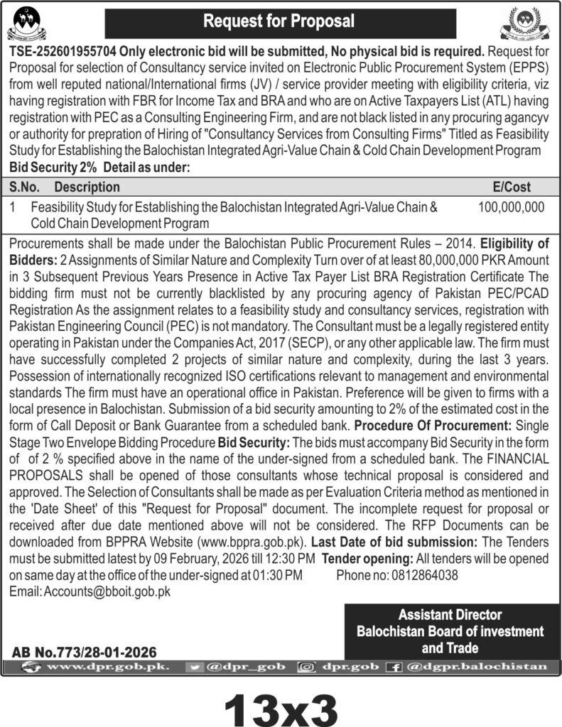 The submission deadline is set for 09 February 2026 at 12:30 PM, with technical and financial proposals to be submitted electronically via the Electronic Public Procurement System (EPPS). Tender opening will occur the same day at 01:30 PM at the office of the Assistant Director, Balochistan Board of Investment and Trade, Quetta.