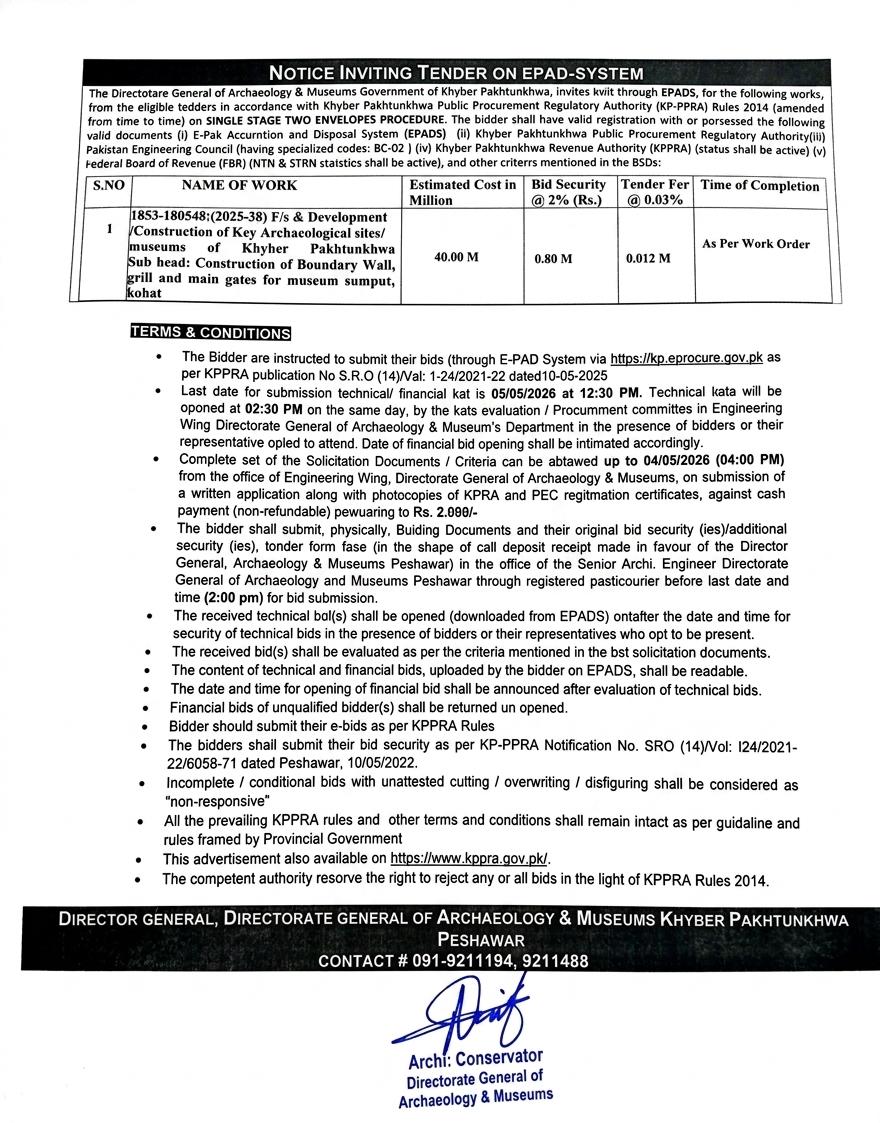 Bidders must submit their bids through the E-PAD system by **05 May 2026 at 12:30 PM**. The technical bids will be opened the same day at 2:30 PM in the presence of bidders or their representatives. A complete set of solicitation documents can be obtained from the Engineering Wing of the Directorate General of Archaeology and Museums Peshawar upon payment of a non-refundable fee of Rs. 2,000. Physical submission of bid security and original documents is mandatory before the deadline.