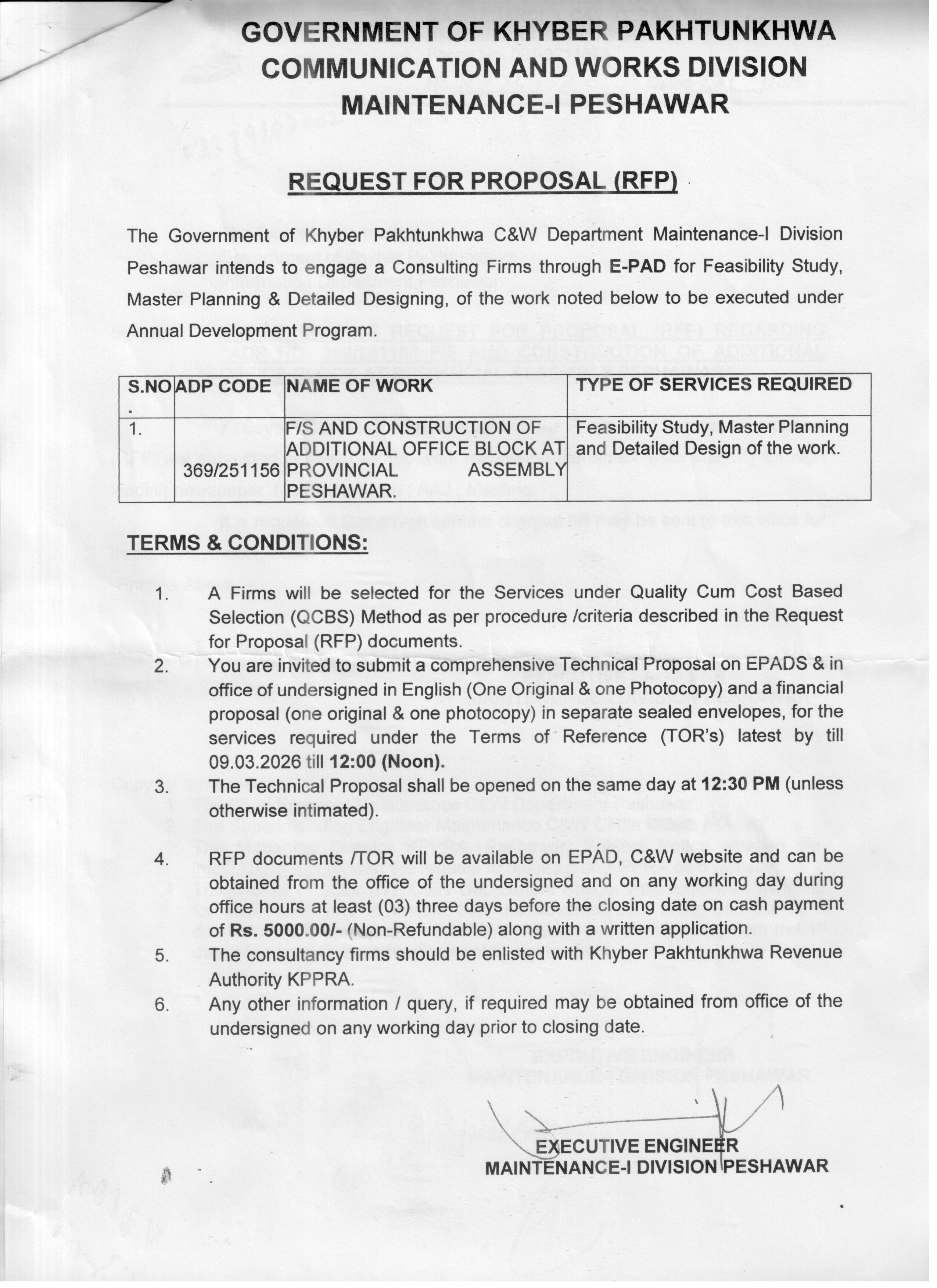 The submission deadline is set for 09 March 2026 at 12:00 Noon, with technical proposals opening the same day at 12:30 PM. Proposals must be submitted in sealed envelopes, one original and one photocopy for both technical and financial bids, to the office of the Executive Engineer Maintenance-I Division Peshawar. Tender documents and Terms of Reference (TOR) are available on the EPAD and C&W websites or from the office upon payment of Rs. 5000 non-refundable fee.