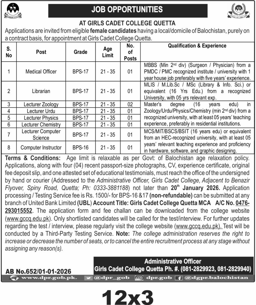 This recruitment drive at Girls Cadet College Quetta invites female candidates domiciled in Balochistan for contract appointments in various medical and academic positions. The college seeks qualified professionals for roles including Medical Officer, Librarian, Lecturers in Zoology, Urdu, Physics, Chemistry, Computer Science, and a Computer Instructor. The opportunity is based in Quetta, offering a chance to contribute to the education and health sectors within the region.