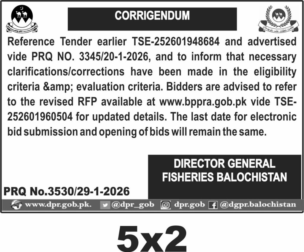 Corrigendum for Fisheries Balochistan Tender Eligibility and Evaluation Criteria Update