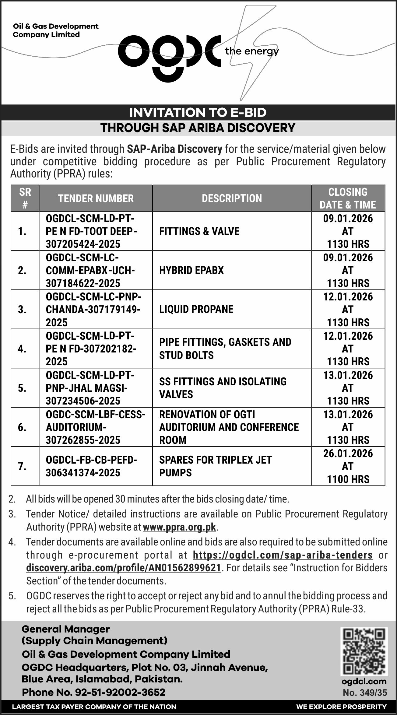 The procurement covers multiple items including pipe fittings, gaskets, valves, hybrid EPABX, and liquid propane with closing dates ranging from January 9 to January 26, 2026. It also includes renovation work for the OGTI auditorium and conference room. Bidders must submit bids online through the SAP Ariba Discovery portal. The tender is issued by OGDC Headquarters in Islamabad with detailed instructions available on the PPRA website.