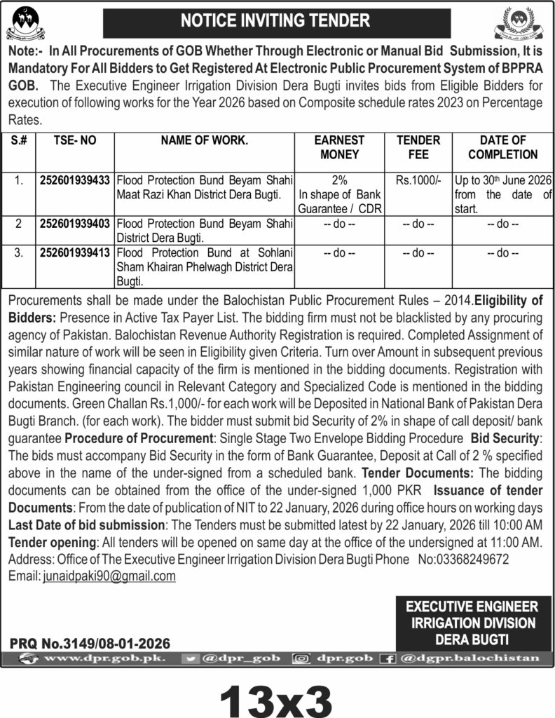 The submission deadline is set for 22 January 2026 at 10:00 AM, with bid opening scheduled the same day at 11:00 AM. Bids must be submitted in sealed envelopes to the office of the Executive Engineer Irrigation Division Dera Bugti. Interested parties can obtain tender documents during office hours until the submission date.