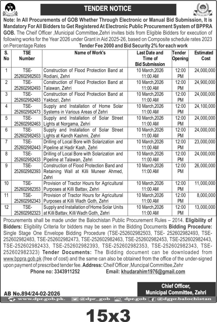 This tender invites bids from eligible contractors for multiple infrastructure and solar energy projects in Zehri, Balochistan, issued by the Municipal Committee, Zehri. The scope includes construction of flood protection bands at various locations, supply and installation of home solar systems and solar street lights, drilling of local bore wells with solarization, and provision of tractor hours for agricultural purposes.