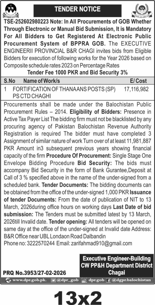 This tender invites bids for the fortification of Thanaans Posts under the Provincial B&R Chaghi office in Chaghi, Balochistan. The project involves strengthening security posts using composite schedule rates 2023 on percentage basis, with an estimated cost of PKR 17,116,982. The work requires experienced contractors familiar with local terrain and security challenges in the region.
