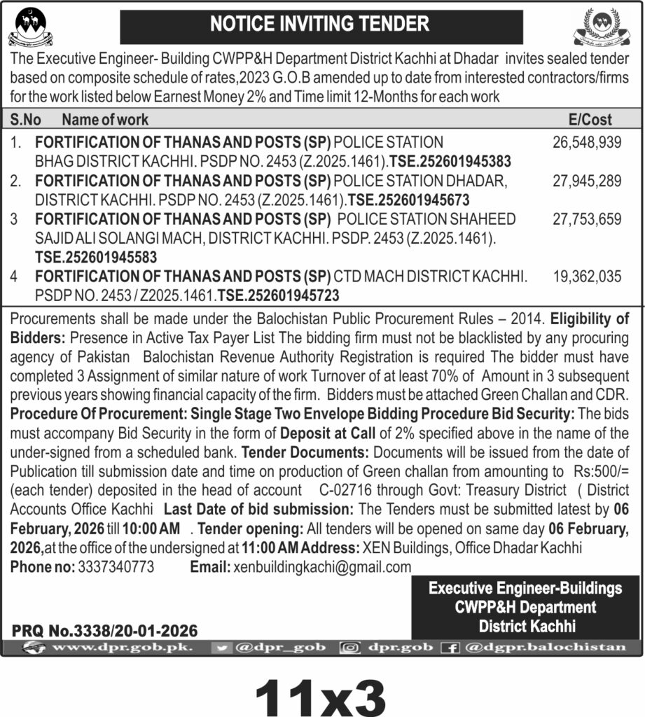 This tender invites contractors in Dhadar, Balochistan, under the CWPP&H Department District Kachhi for fortification works on police stations and posts. The project involves strengthening security infrastructure at multiple sites including Bhag, Dhadar, Shaheed Sajid Ali Solangi Mach, and CTD Mach within District Kachhi.