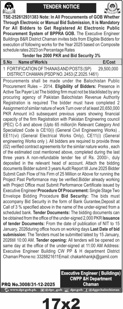 The submission deadline is set for 15 January 2026 at 10:00 AM, with tender opening at 11:00 AM on the same day at the office of the Executive Engineer Building CW PP & H Department, District Chaman. Bidders should submit sealed bids physically during office hours before the deadline.