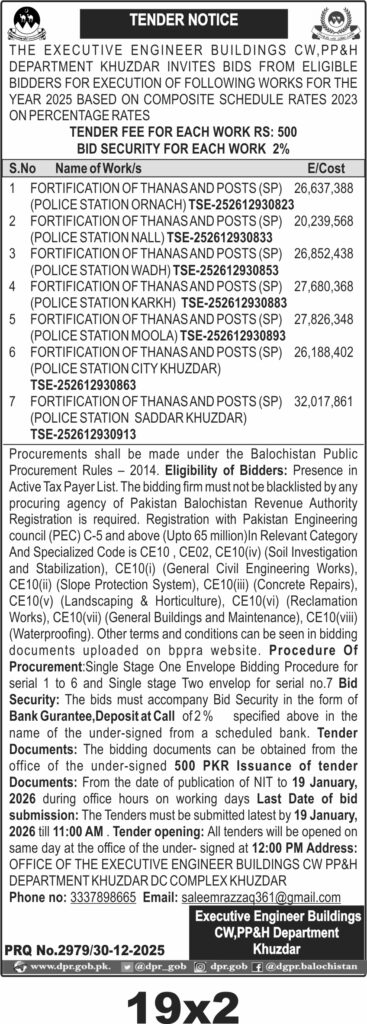 The submission deadline is set for 19 January 2026 at 11:00 AM, with tender opening at 12:00 PM the same day. Bids must be submitted in sealed envelopes at the office of the Executive Engineer Buildings CW, PP&H Department, Khuzdar, located at DC Complex Khuzdar. Tender documents are available for 500 PKR from the office during working hours until the closing date.