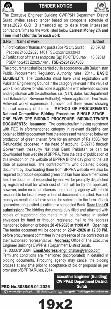 The deadline for submission is on the 20th of January 2026 at 11:00 AM, with the opening scheduled at 12:00 PM the same day at the Executive Engineer Buildings CWPP&H Department District Surab office. Bids must be submitted in sealed envelopes either by hand or registered mail. Late submissions will not be entertained.
