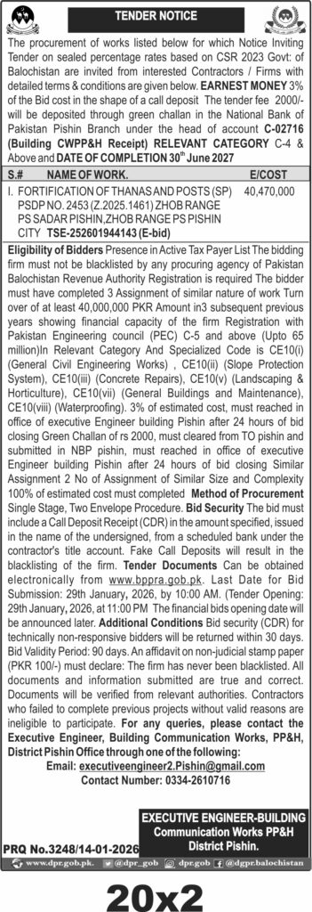 Submission deadline is **29th January 2026 by 10:00 AM** at the office of the Executive Engineer, Building Communication Works PP&H, District Pishin. Tender documents are available electronically at www.bppra.gob.pk. Financial bids opening date will be announced later.