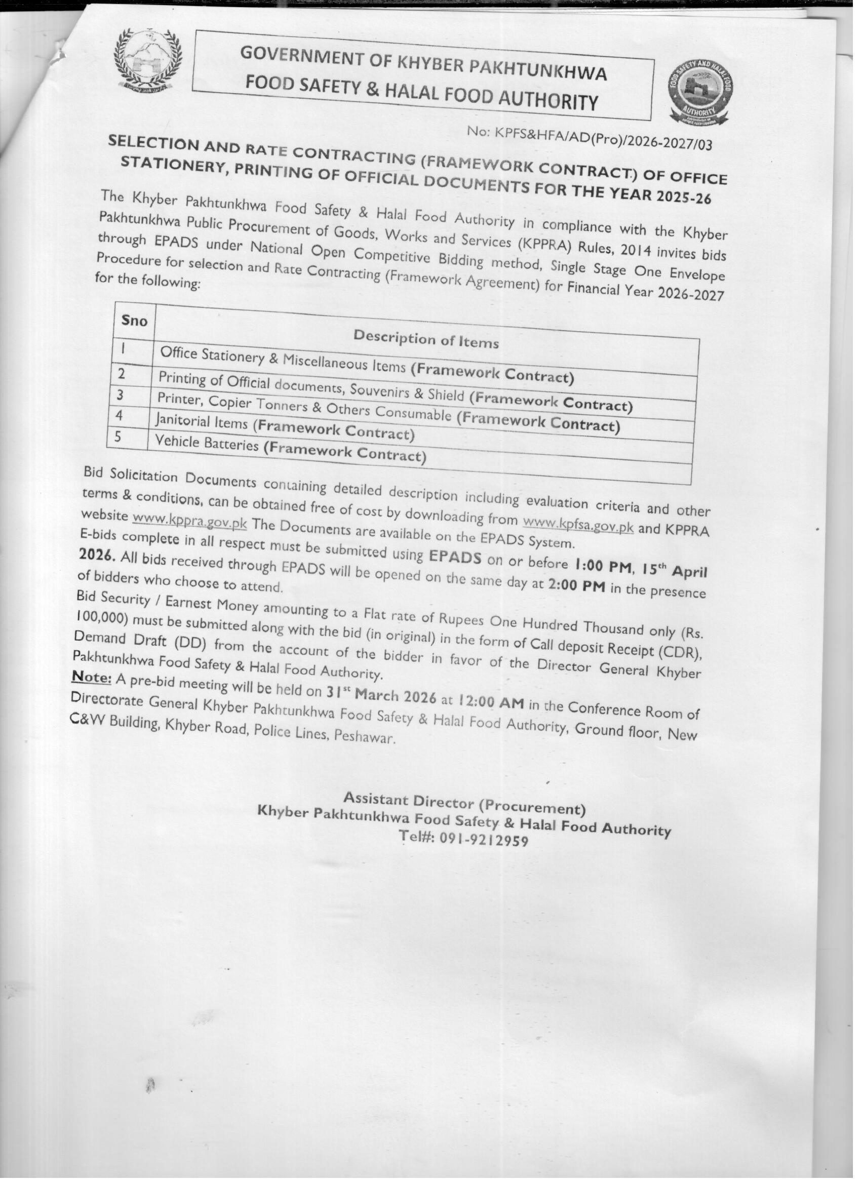 This tender from the Khyber Pakhtunkhwa Food Safety and Halal Food Authority in Peshawar invites bids for a framework contract covering office stationery, printing of official documents, janitorial items, printer consumables, and vehicle batteries for the financial year 2025-26. The procurement falls under the stationery and printing category, essential for smooth administrative operations.