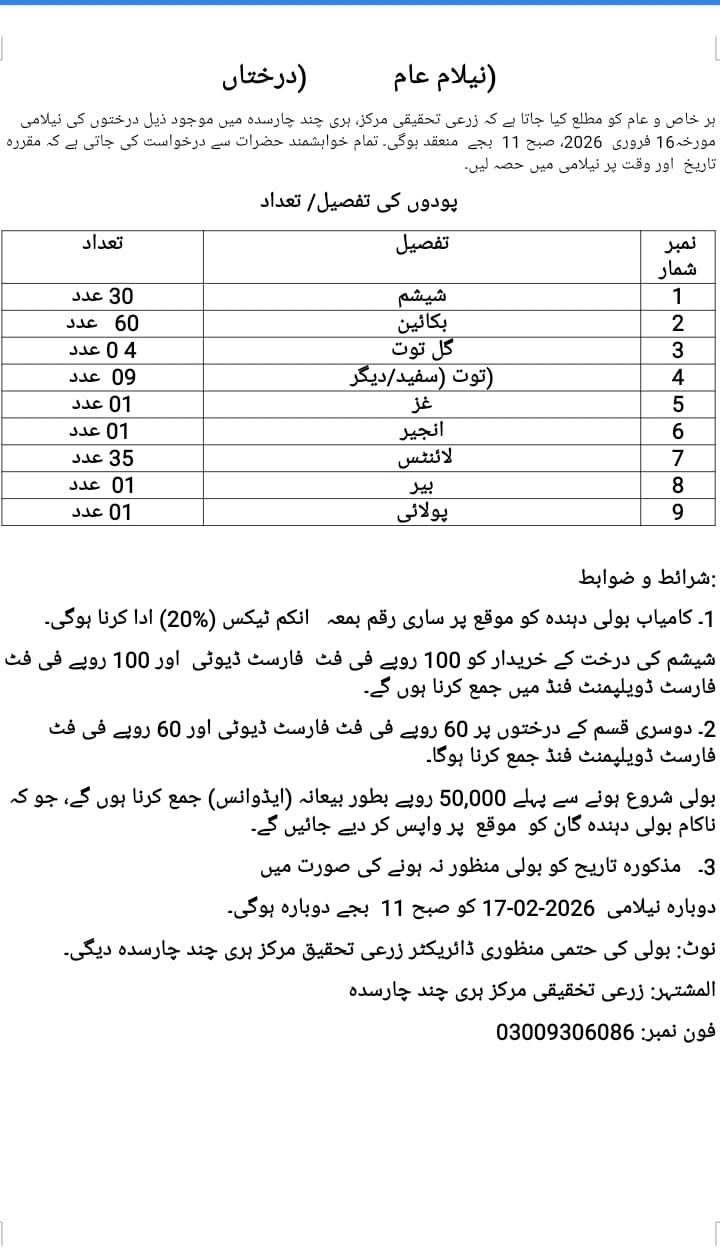 This tender invites suppliers in Charsadda to provide a variety of fruit trees for the Agricultural Research Center. The department requires 30 saplings of Sheesham, 60 of Bakain, 4 of Gul Toot, 9 of Toot (white/other), and other species including Ghaz, Anjir, Lantus, Pear, and Polati. These trees will support ongoing agricultural research and development efforts in the region.