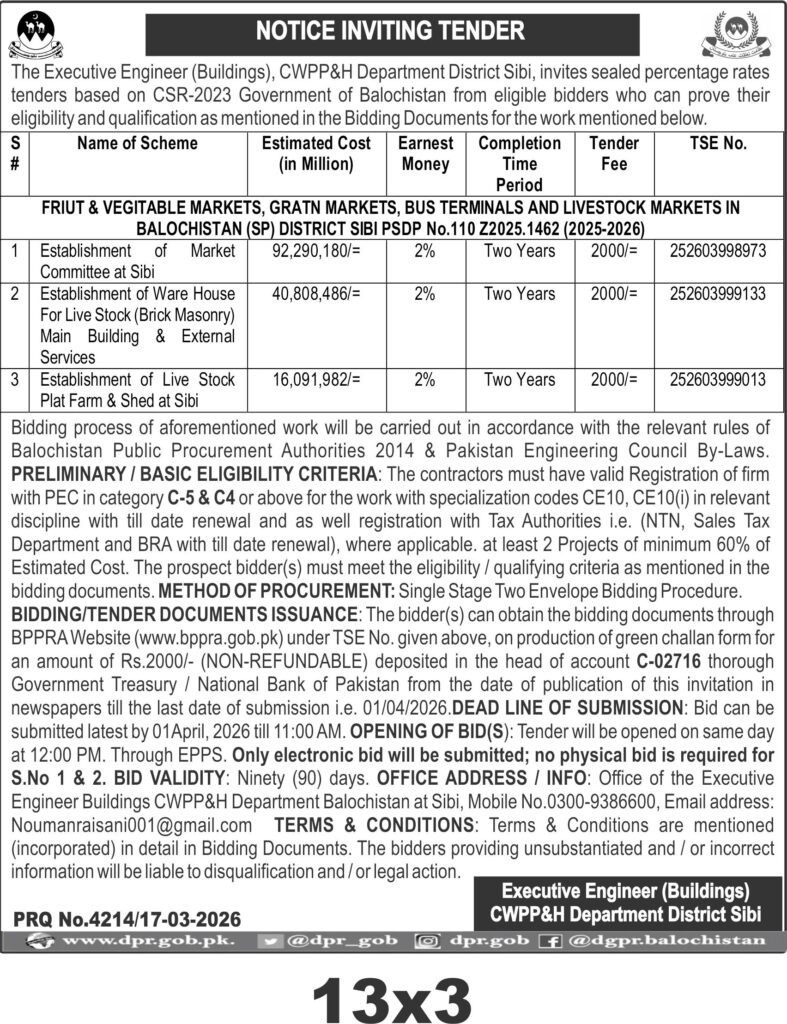 The submission deadline is set for 01 April 2026 by 11:00 AM, with bid opening at 12:00 PM on the same day. Bids must be submitted electronically via EPPS, as no physical bids are accepted for certain items. The office of the Executive Engineer Buildings CWPP&H Department in Sibi is the contact point for further information and document collection.