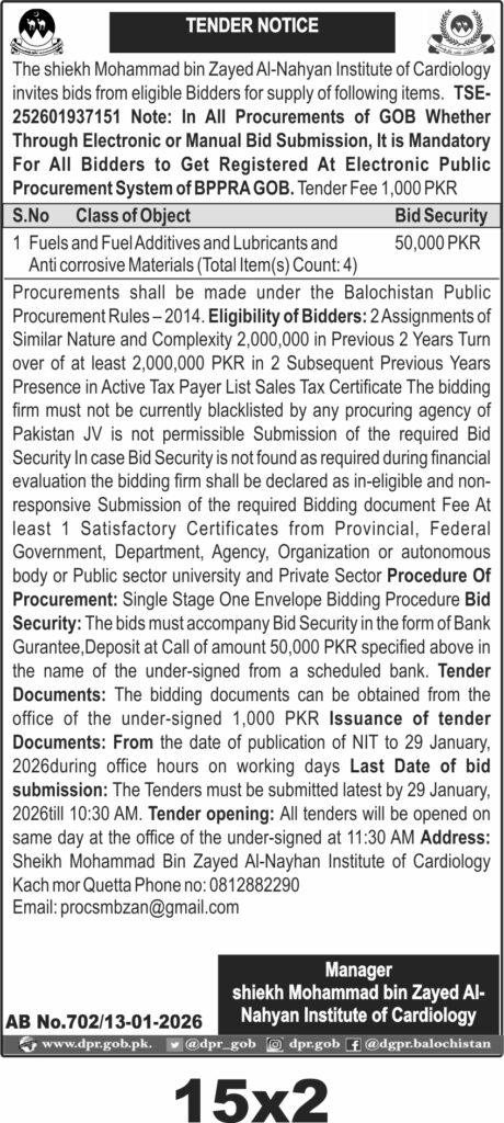 The submission deadline is set for 29 January 2026 at 10:30 AM, with bid opening at 11:30 AM the same day. Bids must be submitted in a sealed envelope to the office of the undersigned at Sheikh Mohammad Bin Zayed Al-Nahyan Institute of Cardiology, Kach Mor, Quetta. Tender documents are available for PKR 1,000 during office hours until 29 January 2026.