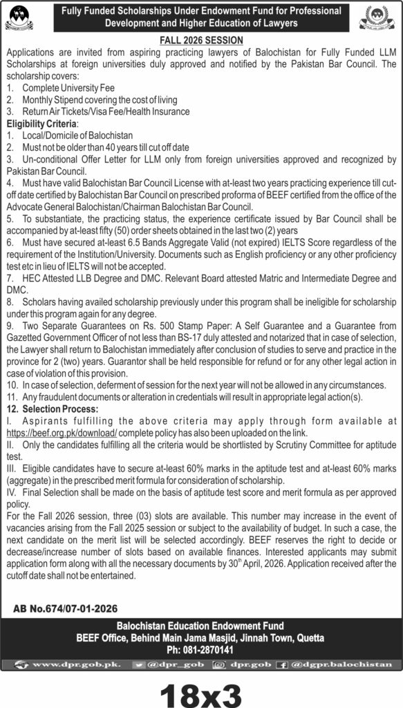 This announcement from the Balochistan Education Endowment Fund in Quetta offers fully funded LLM scholarships for practicing lawyers of Balochistan. The scholarships cover university fees, monthly stipends, and return air tickets along with visa and health insurance, supporting legal professionals seeking advanced education abroad.