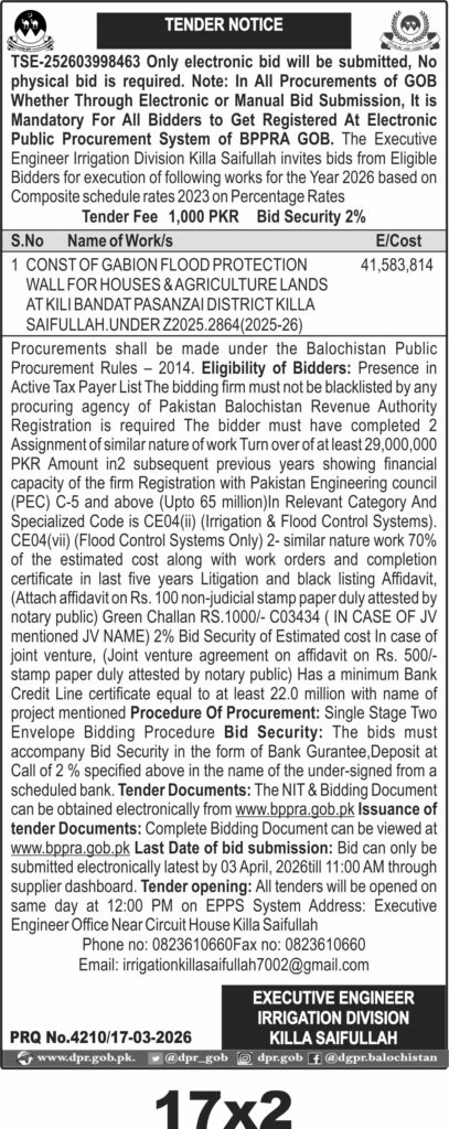 The executing department is the Pakistan Water and Power Development Authority (WAPDA), Irrigation Division Killa Saifullah. Bidders must be registered with the Electronic Public Procurement System of BPPRA and comply with the Balochistan Public Procurement Rules 2014. The project demands PEC registration in category C-5 or above, with relevant codes CE04(ii) for Irrigation & Flood Control Systems and CE04(vii) for Flood Control Systems only. Firms must demonstrate financial capacity with a turnover of at least PKR 29 million in the last two years and provide work completion certificates for similar projects.