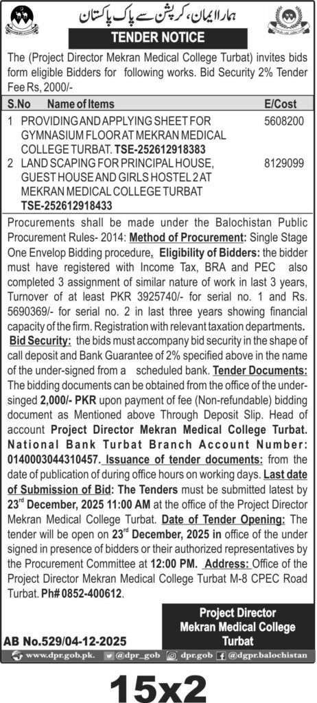 Tender documents are available from the Project Director Mekran Medical College Turbat office. Submission deadline is 23rd December 2025 at 11:00 AM, with opening at 12:00 PM the same day. Contact details and bank account information are provided for fee deposit and inquiries.