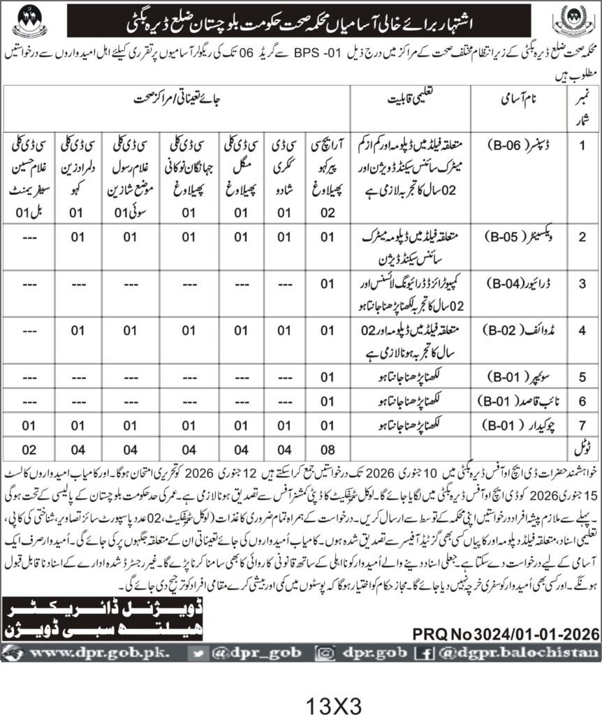 This recruitment notice from the Health Department, Government of Balochistan, invites applications for multiple positions across various health centers in District Dera Bugti. The department seeks qualified candidates for posts ranging from dispatchers and vaccinators to drivers and support staff, all essential for maintaining healthcare services in the region.