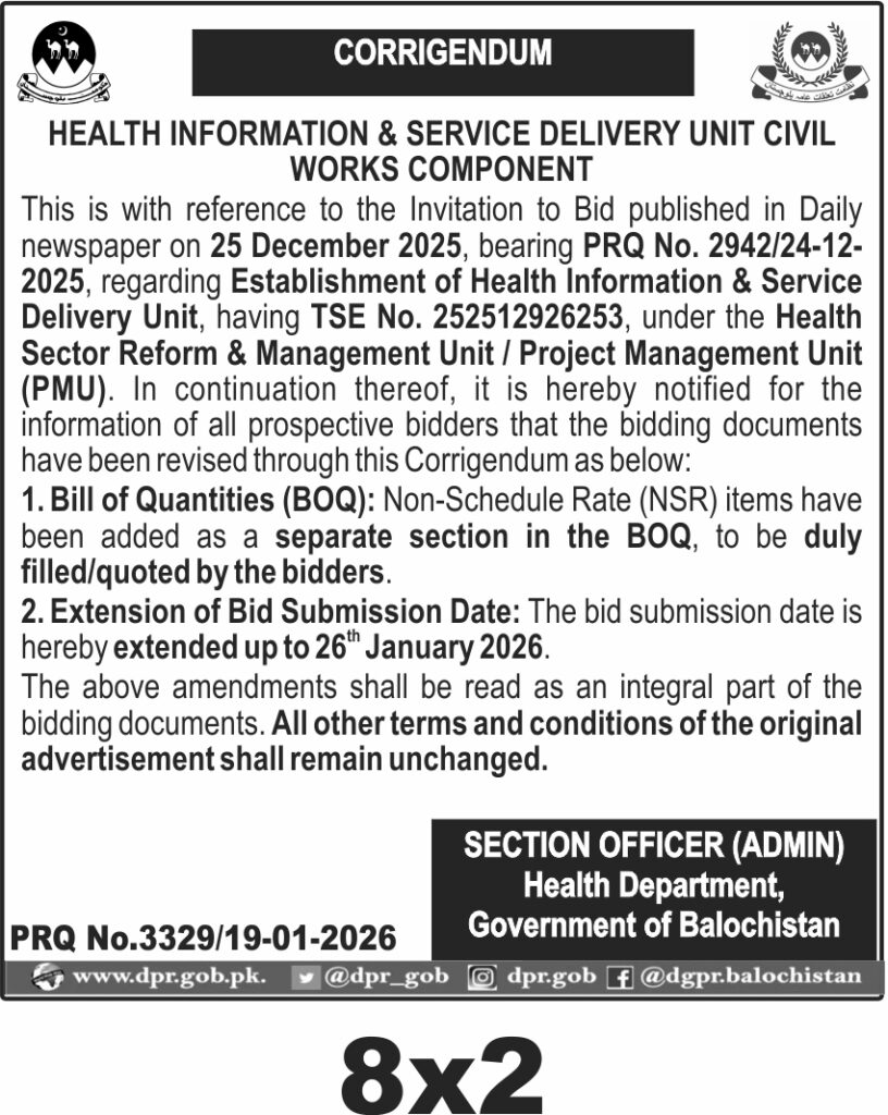 The submission deadline is extended to 26 January 2026, with bids to be submitted by 23:59:59. Bid opening will follow as per the schedule at the Health Department office in Quetta. Interested parties should submit sealed hard copies of their bids to the designated address before the deadline.