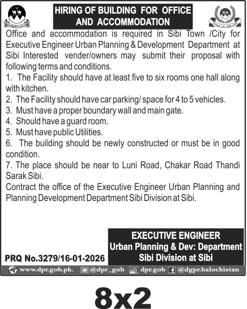 This tender invites proposals for hiring a building to serve as office and accommodation for the Executive Engineer of the Urban Planning and Development Department in Sibi. The requirement is specific to Sibi city, focusing on a facility that supports administrative and residential needs within the department's operational framework.