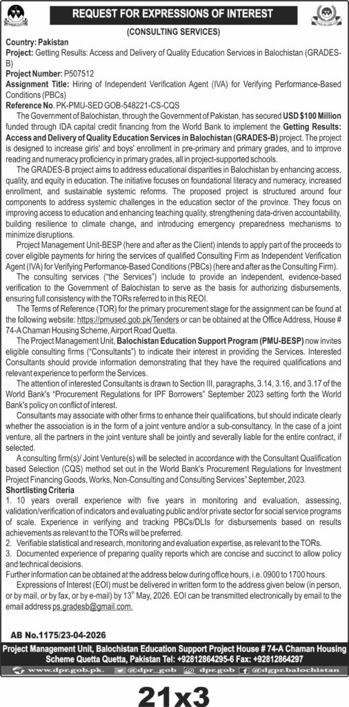 The Balochistan Education Support Program (PMU-BESP) in Quetta is procuring consulting services for hiring an Independent Verification Agent (IVA) to verify Performance-Based Conditions (PBCs) under the Getting Results: Access and Delivery of Quality Education Services in Balochistan (GRADES-B) project. This project, funded by the World Bank, aims to improve educational access, quality, and equity in Balochistan by enhancing literacy, numeracy, enrollment, and systemic reforms in project-supported schools.
