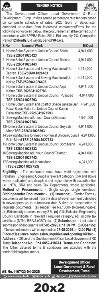 The Local Government and Rural Development Department in Tump, Balochistan, is procuring home solar systems and sewing machines for various Union Councils including Srifkin, Balicha, Tegran, Kallag, Aspi Kahan, Pullabad, Kasnu Dakulabad, Gomazi, Geyaab Mand, Bullo Mand, Soro Mand, Talamb 1, and Libnan Mand. This procurement aims to enhance energy access and support livelihood through solar power and sewing machines.