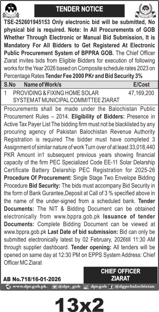 This tender invites bids from eligible contractors in Ziarat for the provision and installation of home solar systems under the Municipal Committee. The project involves supplying and fixing solar power units to enhance energy sustainability in the region, reflecting a focused effort on renewable energy solutions within Balochistan's public infrastructure.