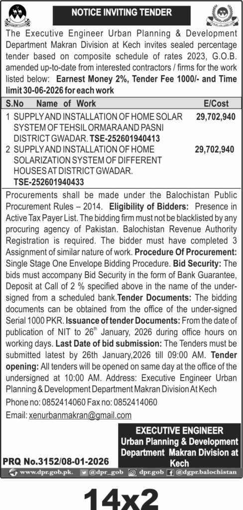 This tender invites contractors in Gwadar for the supply and installation of home solar systems in Tehsil Ormara and Pasni, as well as other houses in Gwadar District. The Urban Planning and Development Department Makran Division at Kech requires these solar systems to enhance energy access in remote areas, using quality solar panels and installation materials compliant with the latest composite schedule of rates 2023, G.O.B. The project demands technical expertise to handle site-specific challenges such as terrain and weather conditions in Gwadar.