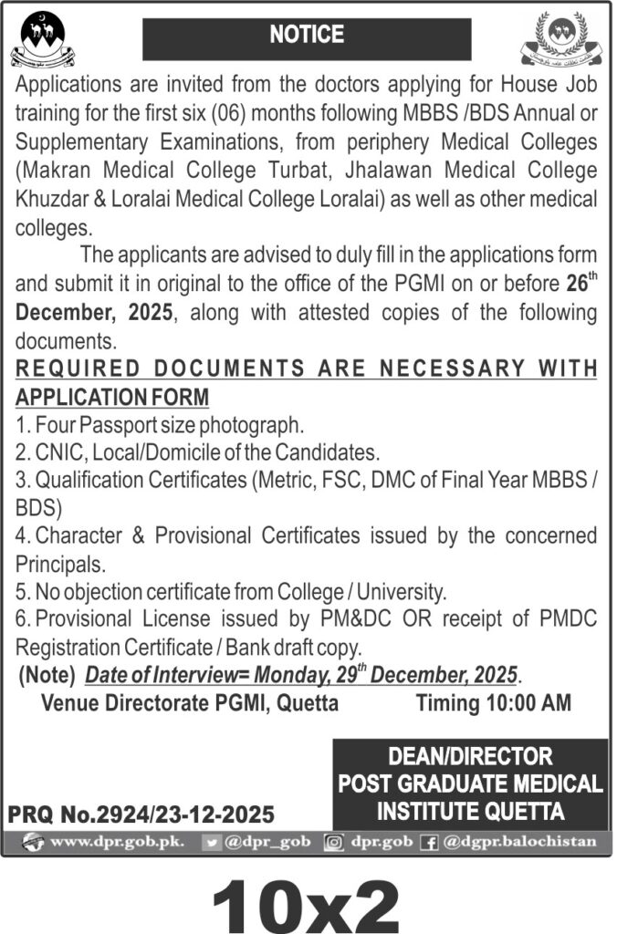The interview date is 29th December 2025 at PGMI Quetta at 10:00 AM. This opportunity is open to doctors from specified medical colleges and other medical institutions as per eligibility criteria.