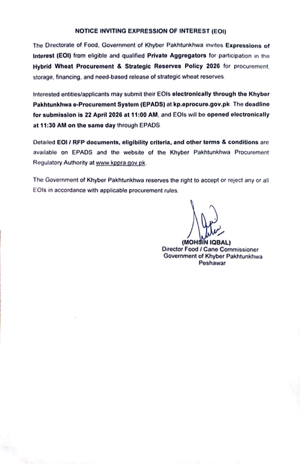 This tender from the Directorate of Food, Government of Khyber Pakhtunkhwa, based in Peshawar, invites qualified private aggregators to participate in the Hybrid Wheat Procurement and Strategic Reserves Policy 2026 under the Agricultural Inputs & Equipment category. The department seeks to engage entities for procurement, storage, financing, and need-based release of strategic wheat reserves.