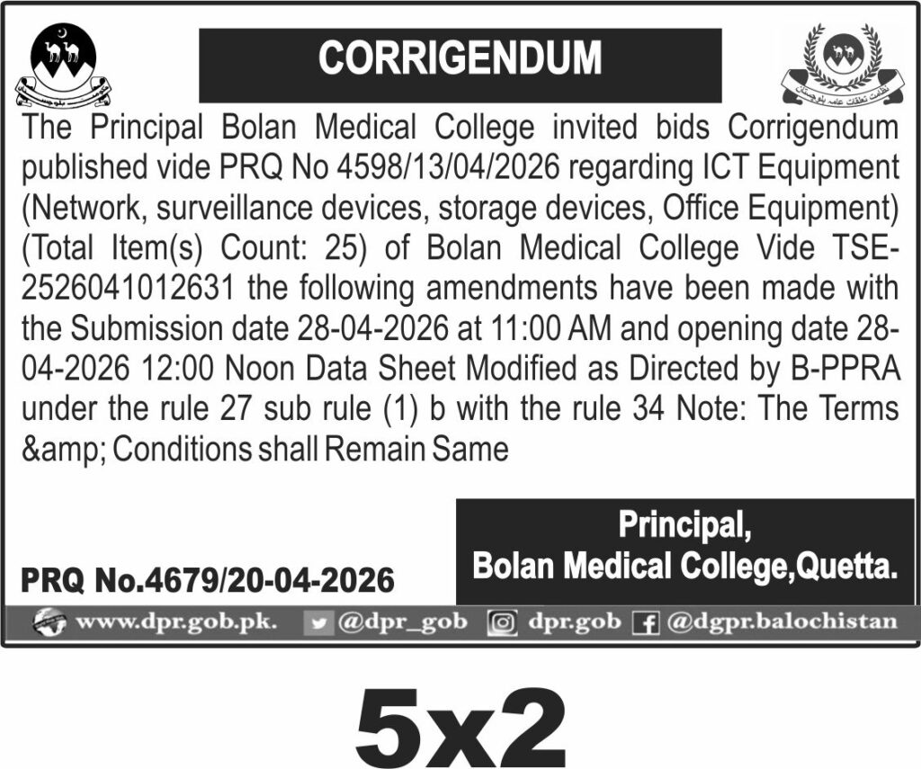 The submission address is the office of the Principal, Bolan Medical College, Quetta. Bidders are advised to carefully review the corrigendum and ensure all amendments are incorporated in their bids. One practical tip is to double-check the technical bid against the modified data sheet to avoid disqualification due to non-compliance. Timely submission before the deadline is crucial to participate in this procurement.