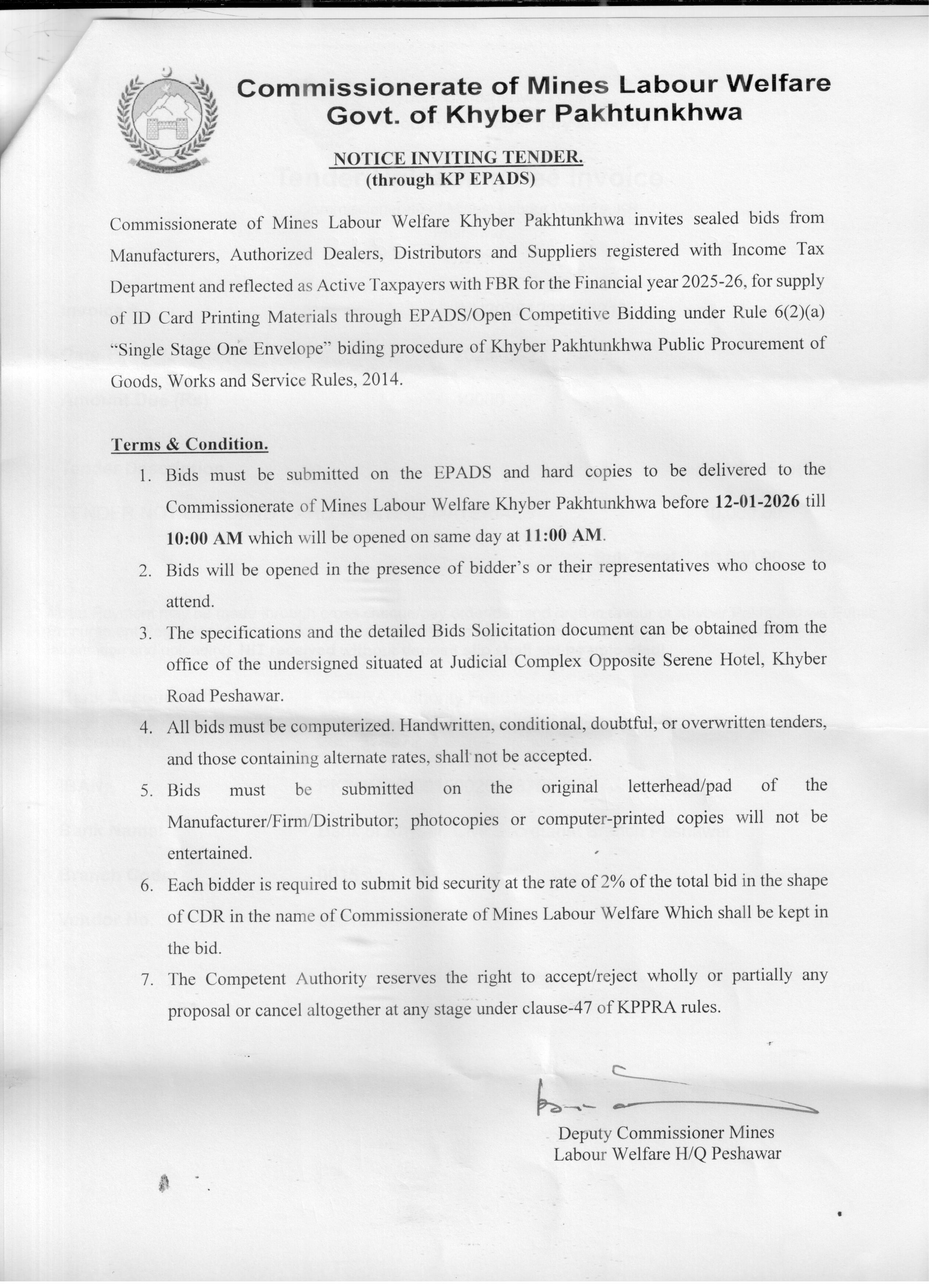 The Commissionerate of Mines Labour Welfare Khyber Pakhtunkhwa invites sealed bids for the supply of ID card printing materials in Peshawar under the stationery and printing category. Bids are invited from registered manufacturers, dealers, and suppliers. The procurement is conducted through KP EPADS using a single stage one envelope bidding procedure.