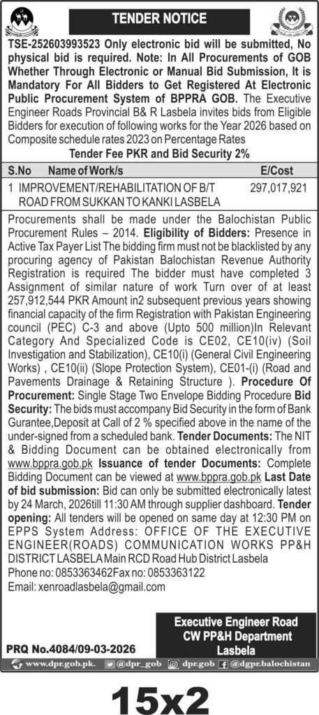 The submission deadline is **24 March 2026 at 11:30 AM**, with electronic bids only via the supplier dashboard on the EPPS system. Tender opening will occur the same day at 12:30 PM. The physical office for inquiries is the Office of the Executive Engineer (Roads) Communication Works PP&H District Lasbela, Main RCD Road Hub District Lasbela.