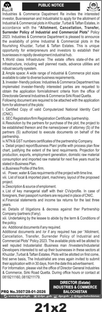 Allotment of Industrial and Commercial Plots in Khuzdar, Turbat and Taftan Estates