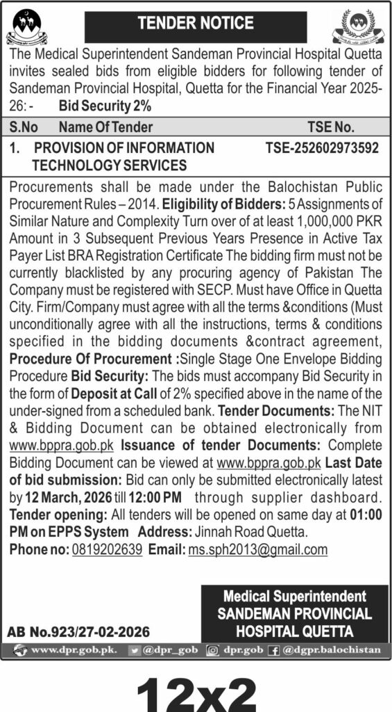 This tender invites qualified bidders in Quetta to provide specialized Information Technology services for Sandeman Provincial Hospital. The department requires firms with proven experience and a strong local presence to support the hospital's IT infrastructure and operations.