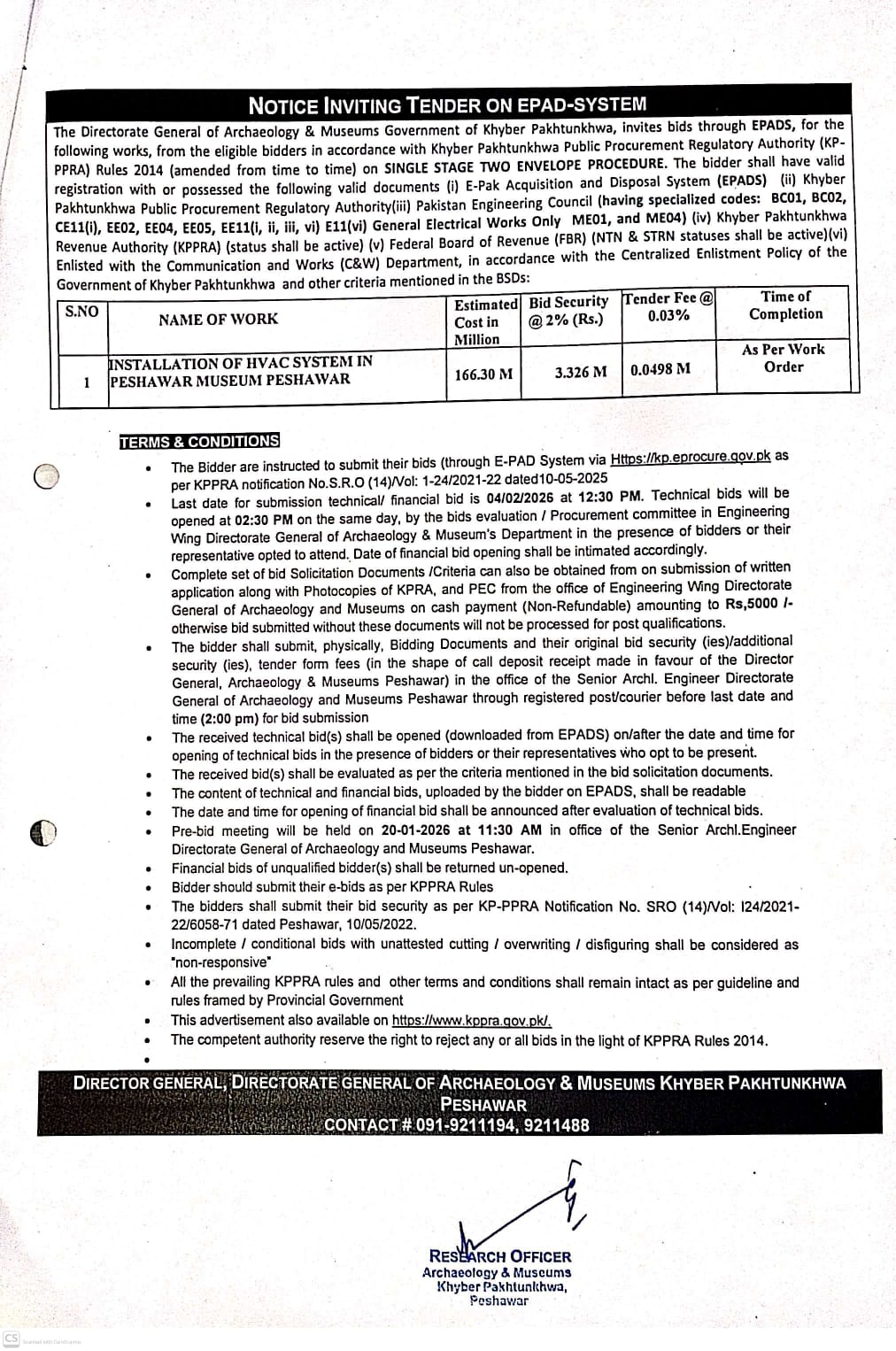 The submission deadline is set for 04 February 2026 at 12:30 PM, with technical bids opening the same day at 2:30 PM at the Directorate General of Archaeology and Museums office in Peshawar. Physical submission of bidding documents, including original bid security and tender fees, is mandatory before 2:00 PM on the closing date.