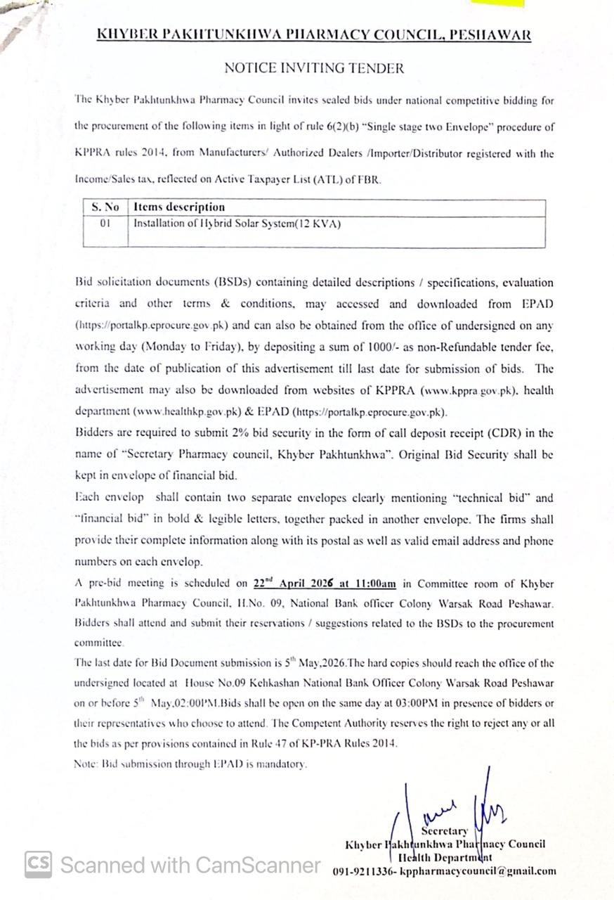 Eligible bidders must be manufacturers, authorized dealers, importers, or distributors registered with the Income/Sales Tax authorities and listed on the Active Taxpayer List (ATL) of the Federal Board of Revenue (FBR). Firms should have relevant experience in solar system installations and must comply with the Khyber Pakhtunkhwa Public Procurement Regulatory Authority (KPPRA) rules 2014. Submission of 2% bid security in the form of a Call Deposit Receipt (CDR) in the name of Secretary Pharmacy Council, Khyber Pakhtunkhwa, is mandatory.